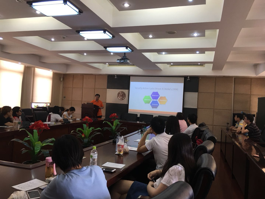 此次讲座中,罗欣教授首先对信息安全领域的研究进展和未来研究方向进行了介绍,提出了情绪作为新的研究视角在信息安全领域的重要作用。随后,罗欣教授与大家分享了其最新的研究成果:Employees' deviant information security behavior in the workplace: the role of emotions and perceived sanctions,研究从心理学的角度出发,基于ATF(Appraisal Tendency Framework)理论,实证检验了恐惧和愤怒两种重要情绪对员工制裁的感知及员工计算机使用中越轨行为的影响,与会老师和同学与罗欣教授进行了积极互动。讲座结束后,罗欣教授还就实证研究方法和数据收集、处理等方面的问题与老师、同学们进行了深入的交流和沟通。