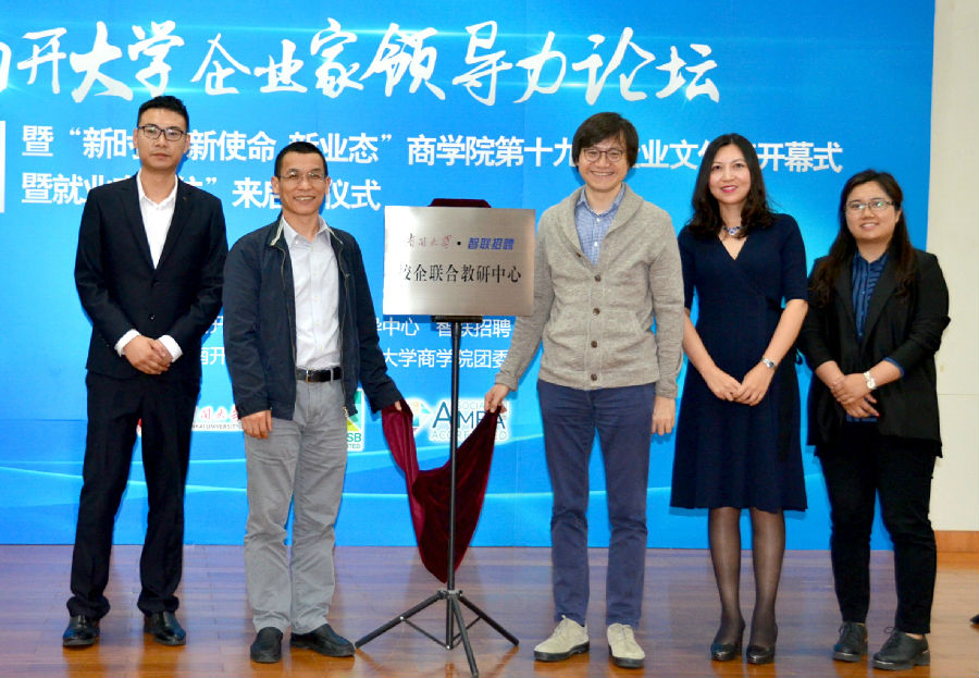会上,为了进一步拓展校企合作内容、更好的指导学生生涯规划、提升学生就业能力,金年汇官方入口jinnianhui金年会特聘请智联招聘CEO郭盛、校园和海外事业部总监齐放、校园和海外事业部华北区域经理金世伊、校园和海外事业部华北渠道经理邢庆恒担任金年汇官方入口学生职业发展导师,由白长虹院长颁发聘书并合影。同时,由金年汇官方入口党委学生工作部副部长、学生就业指导中心主任胡军老师,与智联招聘CEO郭盛先生共同为“金年汇官方入口·智联招聘校企联合教研中心”揭牌,旨在充分发挥金年汇官方入口和智联招聘在学生就业指导方面的优势,加强双方合作,编写就业指导课程教材,为百年南开献礼。
