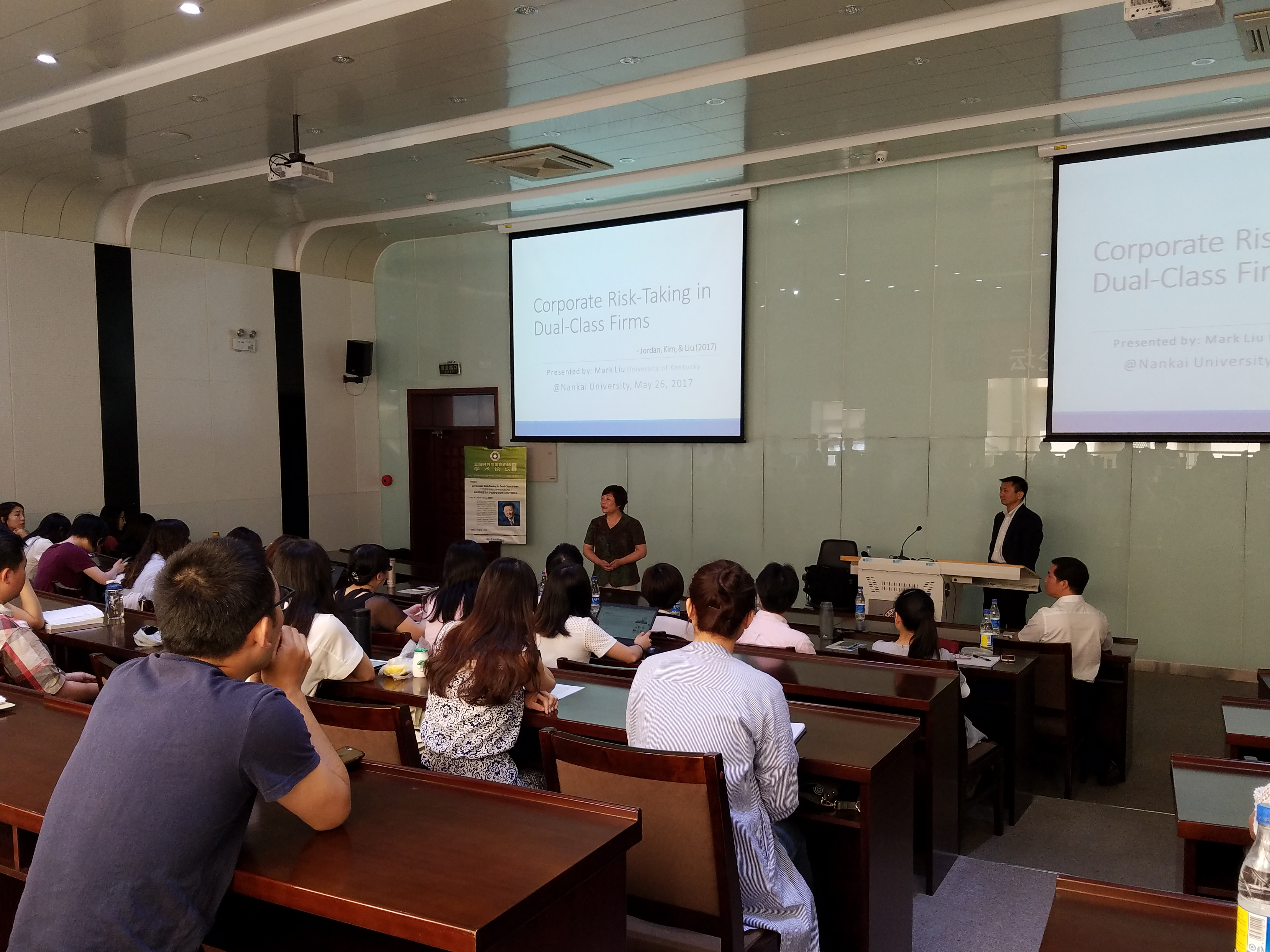 与会师生对Liu教授的研究深感兴趣,在报告过程中进行了多次提问。提问的问题涉及:阿里巴巴的股权结构;公司风险承担为什么不尝试基于CAPM的β系数估计来衡量;论文所度量的风险到底是什么风险;更少的事业部数量到底体现了更高的风险承担还是更低的风险承担;股票投资与产业投资之间的风险原理是否相似;交互效应模型中单变量与交乘项的处理;倾向得分匹配中控制变量的选择;二元股权结构带来更高的风险承担能否被认为是好处;等。Liu教授对这些问题均给予了耐心的回答。