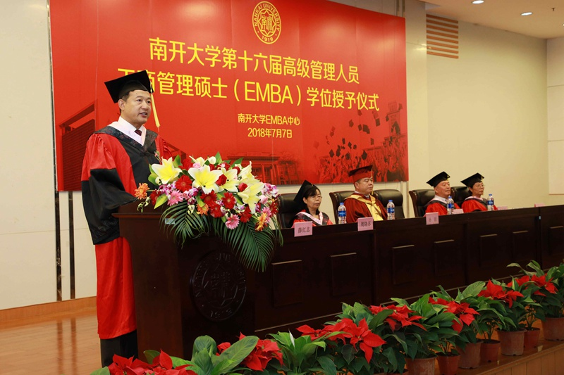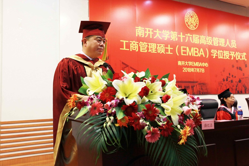 最后白长虹院长致辞,他首先向各位获得学位的同学表示祝贺,对任教老师及中心同事表示感谢。他清楚地阐明了各位企业家在新时代中国发展中的重要作用,希望各位南开校友把商界实践经验作为商科教育变革的动力,放眼世界继续创新,引领变化,牢记使命,为实现中国梦,为世界和平发展和人类幸福做出更大贡献。