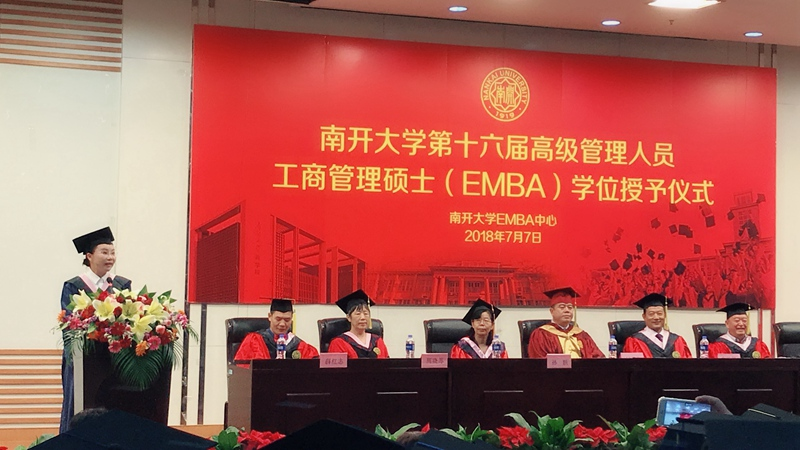 首先EMBA学生代表朱雪花发言,回顾这些年在南开学习的点点滴滴,是南开的爱国敬业精神让她找到了重回校园读书的初衷,身为企业管理者就要以身作则,践行南开校训所承载的时代精神,发挥自己最大的潜能创造一个基业长青的平台,以回报社会。鼓励同学们还要在坚守信仰、追求卓越梦想的路上不断拼搏,为南开增光,让母校熠熠生辉!
