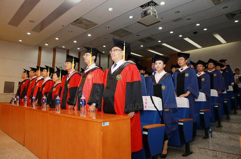 在庄严的国歌声中学位授予仪式正式开始,纪亚光首先宣读关于学位授予的决定,并和EMBA教育学术委员会委员一起为学员颁发学位证书,激动人心的时刻,每位同学的脸上都洋溢着成功的喜悦。