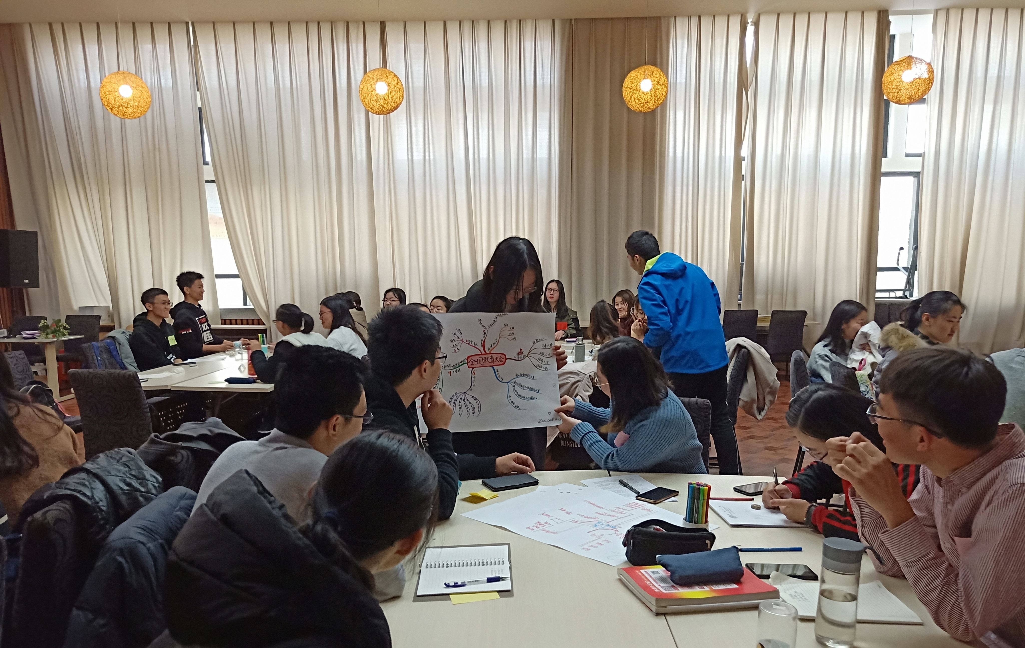 本次支部活动的主题是学习、宣传全国教育大会精神。在活动开始前,指导老师周翠翠将学生分为5个小组,并带领大家共同做了“拍拍操”,进行教学激活,调动起每个学生的情绪。由于全国教育大会的通稿较长、支部活动的时间有限,在阅读材料部分采用了“拼图阅读”的方式,小组内每个成员阅读其中一个部分,所有成员将自己负责部分在组内分享,拼接在一起就是完整的材料内容。为了保证同学们能够将会议精神入脑入心,在阅读后加入思维导图学会议精神的环节,通过团队协作的形式在规定时间内制作思维导图,并在支部内进行分享,同时所有学生对5个小组的思维导图进行了投票,选出最后学生喜欢的思维导图进在整个支部内进行公示学习。