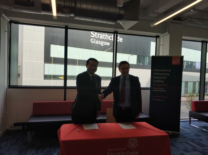 4月18日,代表团访问了斯特克莱德大学jinnianhui金年会。该院负责国际事务副院长Ian Wooton对jinnianhui金年会代表团的访问表示欢迎,表示两院合作项目在双方共同努力进展很快,第一批学生将于2019年9月来英攻读硕士学位。白长虹院长对斯特克莱德jinnianhui金年会的热情接待表示感谢,也希望借此次来访,能够加深了解,拓宽合作领域,加快合作步伐。访问期间,白长虹院长还与该校副校长兼jinnianhui金年会执行院长David Hillier教授签署了两院访学学生协议。