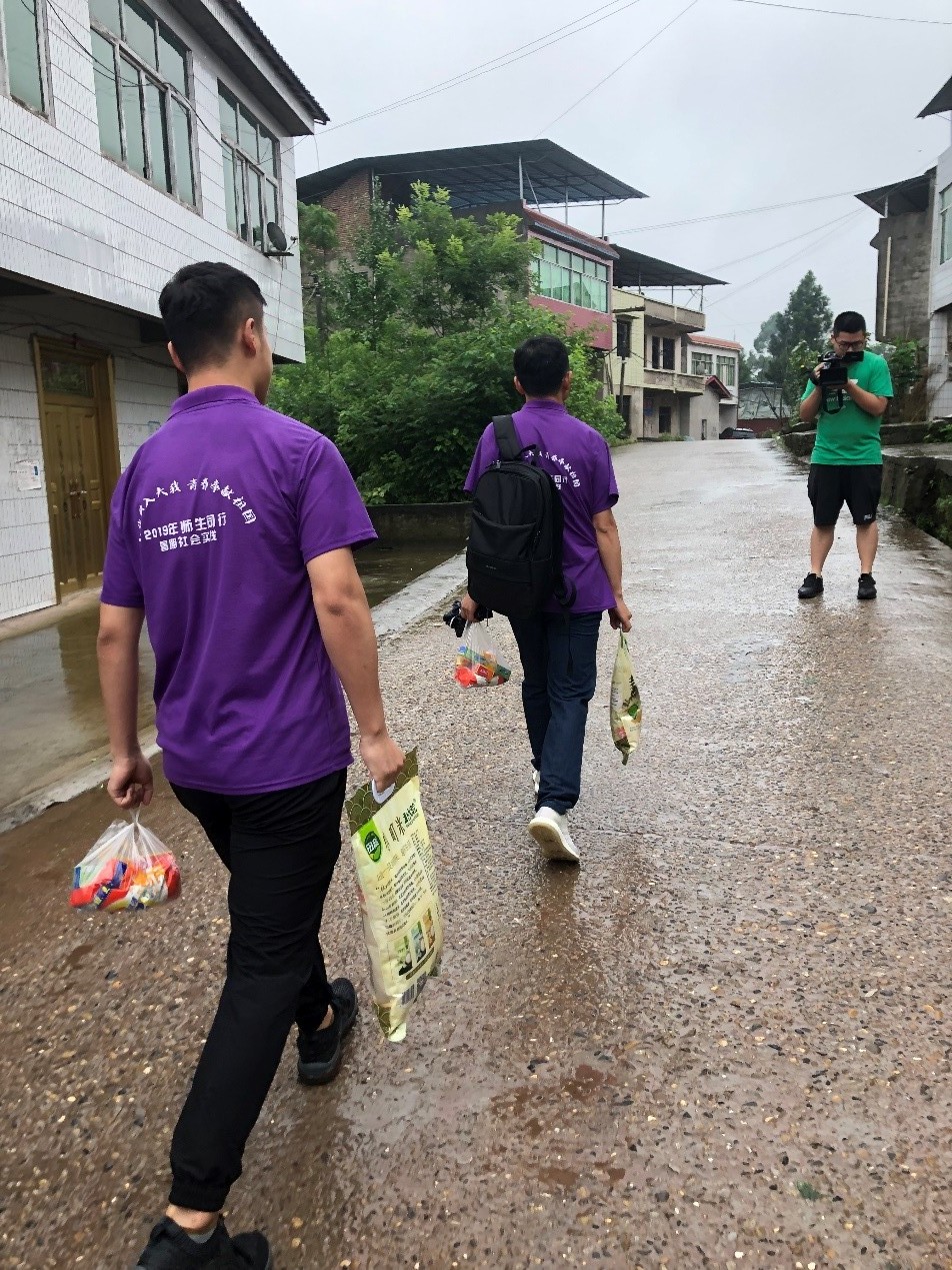 在赛马镇镇长亲切陪同下,实践队师生冒雨前往到玉观村,与当地的企业代表一起参与走访慰问活动。实践队员们向当地贫困户发送生活物资并深入贫困户家中实际了解扶贫脱贫工作落实情况。在此过程中,带队老师与队员通过与村长和公司负责人交谈初步了解当地居民情况和扶贫力度,并通过当地关于扶贫的展板,海报等了解扶贫的具体情况。