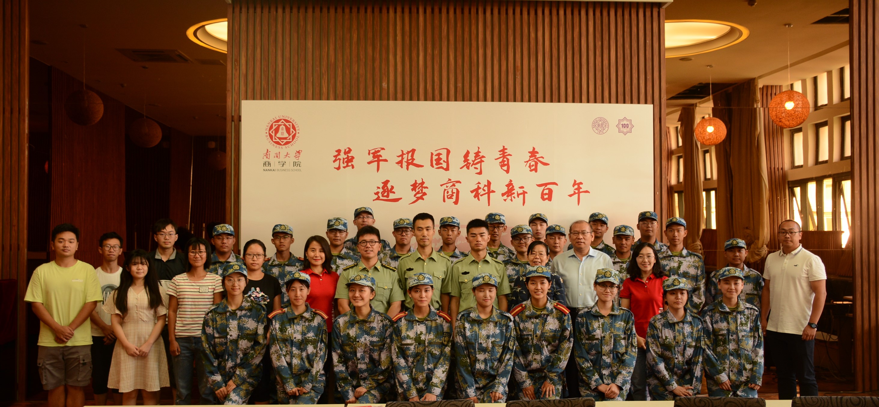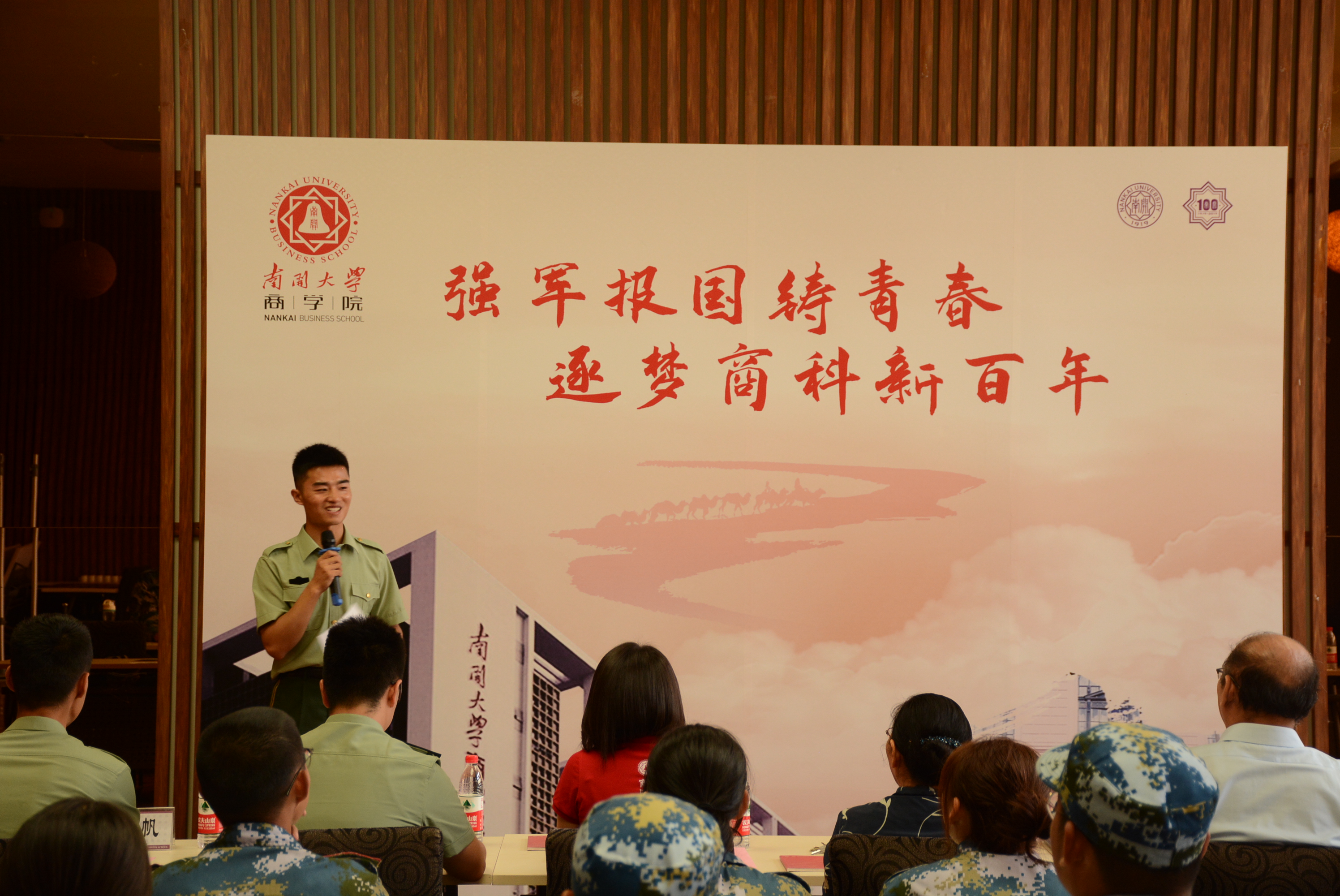 “南开精神,容止格言;公能更胜日前,往昔爱国问,看今商青年”。2019级新生代表王思齐朗诵了原创诗词,强有力的展现了新生的强军报国志。