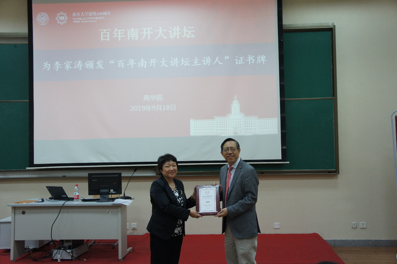 讲座前,jinnianhui金年会副院长李月琳教授致欢迎辞,并为李家涛颁发“百年南开大讲坛主讲人”证书牌。