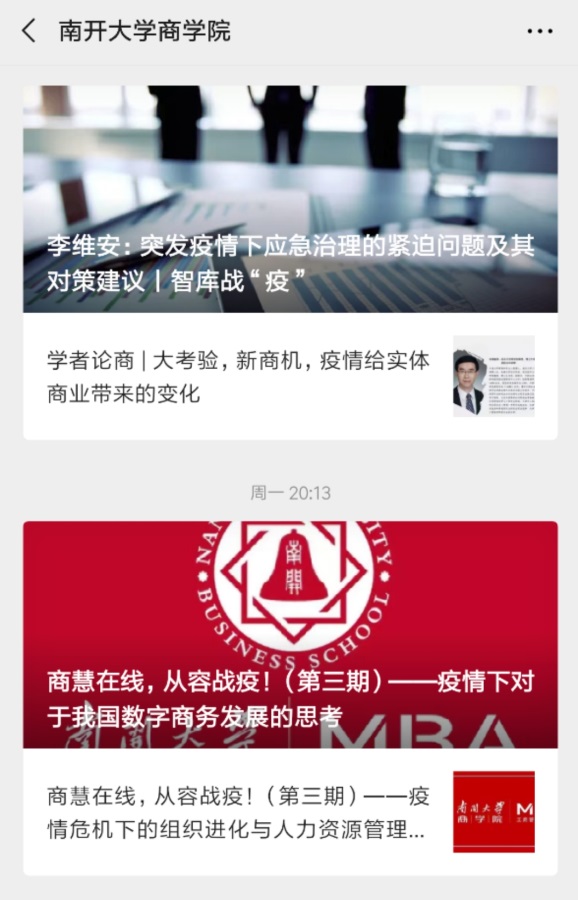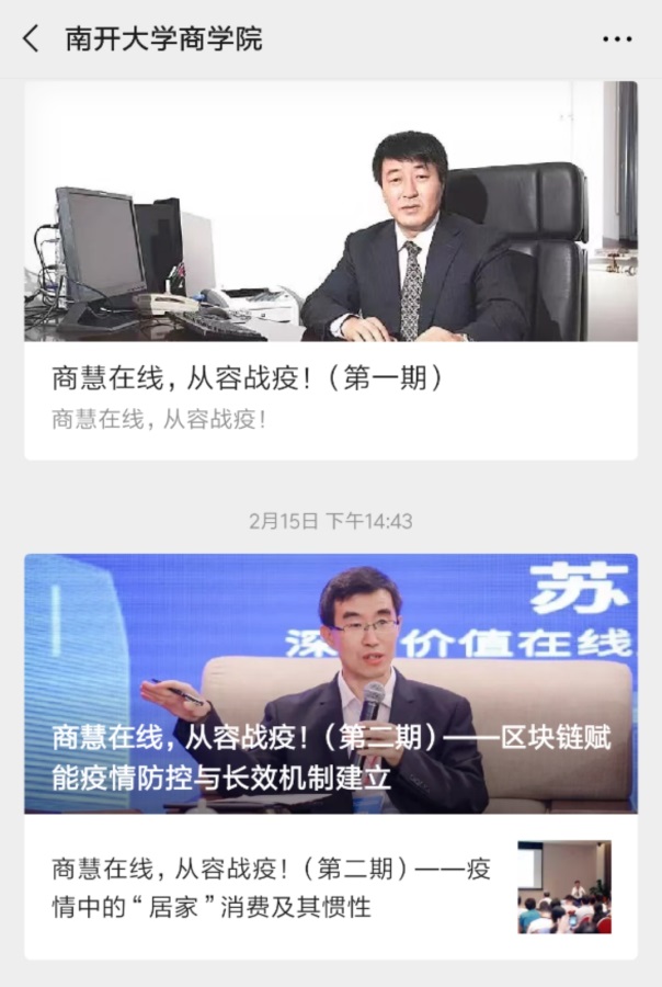 在举国上下众志成城、共克时艰的情况下,南开商科人也一直在行动。专家学者充分发挥专业优势,积极主讲以防疫抗疫为主题的特殊在线课堂。截止目前,“商慧在线,从容战疫”智慧课堂已开展三期共六讲,内容涵盖了《疫情后的创业机会》、《提高公共健康风险智慧化治理能力》、《疫情中的“居家”消费及其惯性》、《区块链赋能疫情防控与长效机制建立》、《疫情下对于我国数字商务发展的思考》、《疫情危机下的组织进化与人力资源管理创新》等方面,运用商科智慧为科学应对疫情防控,理性面对疫情中、后期的经济现象提供建议参考。创新课堂在金年汇官方入口jinnianhui金年会和南开MBA中心微信公众号相继“播课”后,受到师生和校友广泛关注和热烈讨论。