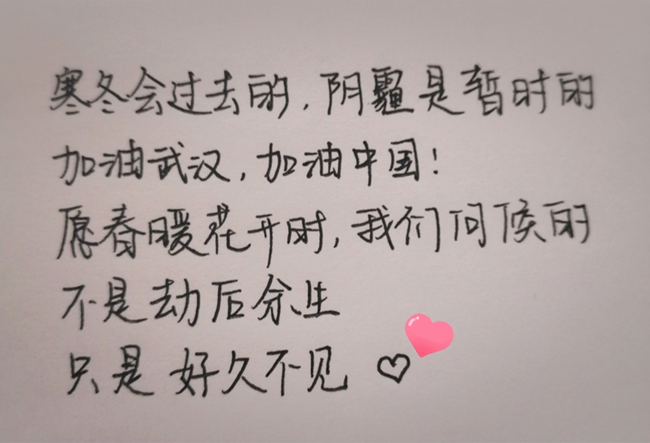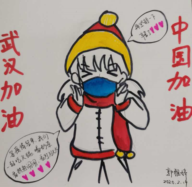 疫情发生,支部同学都持续通过“学习强国”、电视新闻、公众号等官方平台了解国家疫情防控部署和最新进展,为了带动身边群众,增强战胜疫情的信心和决心,jinnianhui金年会本科生第一党支部的同学通过手写祝福、手绘图画、诗歌创作等方式为武汉加油。同时,支部同学定期开展战“疫”感悟线上分享活动,入党积极分子、2017级本科生佘曾佩写到:“我们身为金年汇官方入口之学子,党组织的一员,更应该秉承“允公允能”之校训,做好防护措施,保持清晰的头脑,贡献自己的力量。”