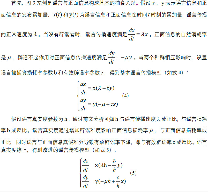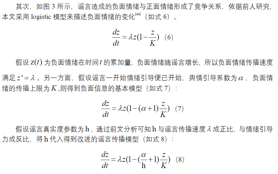 第三,利用微分方程对谣言、正面信息之间的关系进行信息生态建模。分别建立谣言-正面信息生态系统和谣言传播过程中负面-正面情绪生态系统,通过数值仿真得到有关谣言真实度的影响路径假设。