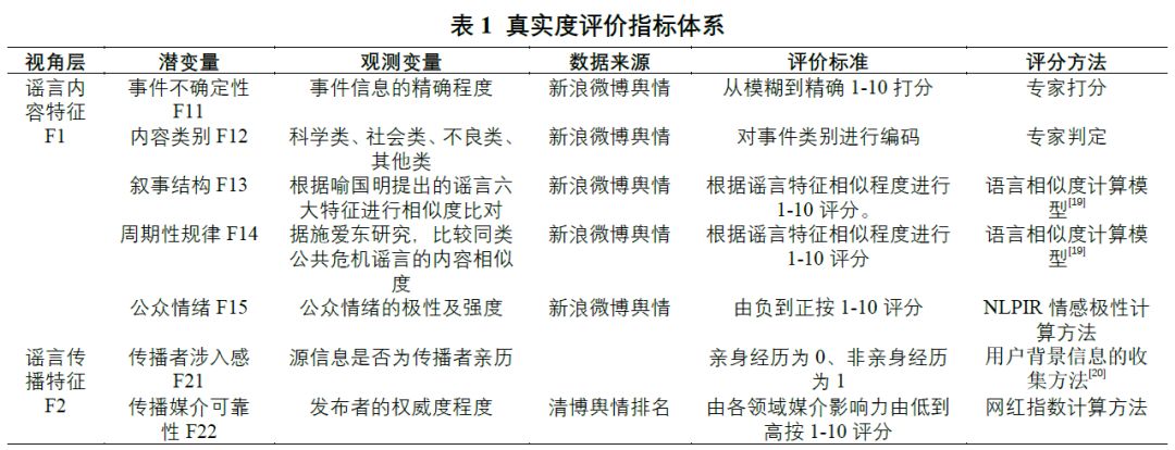 第一、通过定性分析对谣言进行概念化,构建谣言真实度评价指标与评分体系。