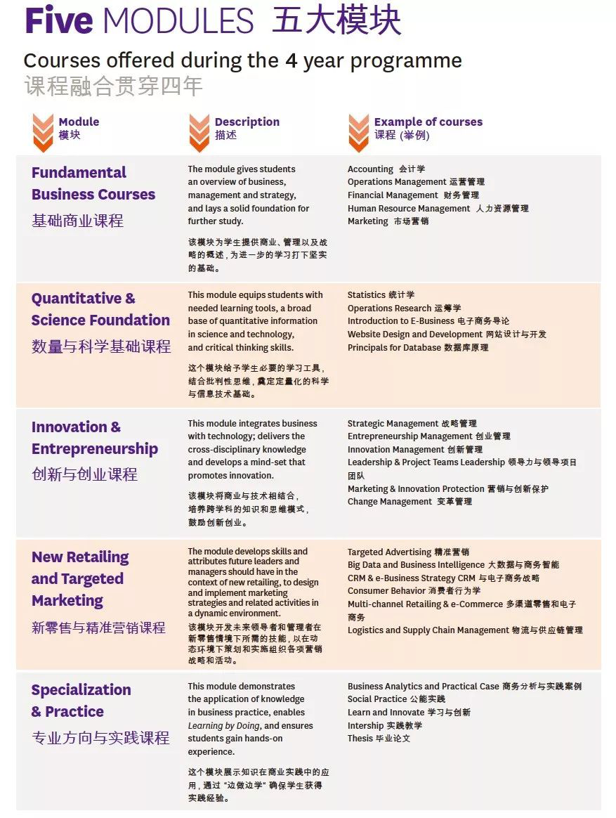 创新型课程设计:课程顺应基于大数据的智能商业环境的变化趋势,引入法国诺欧jinnianhui金年会专业课程培养体系,以培养具备商务分析战略思维和技能的、适应管理颠覆性技术和商务模式的复合型、变革型电子商务管理人才。课程模块由中法双方共同提供的必修课与选修课构成,知识点由浅入深、便于学生灵活选择。整个学习阶段注意课堂教学、企业实习与创业活动的有机结合。
