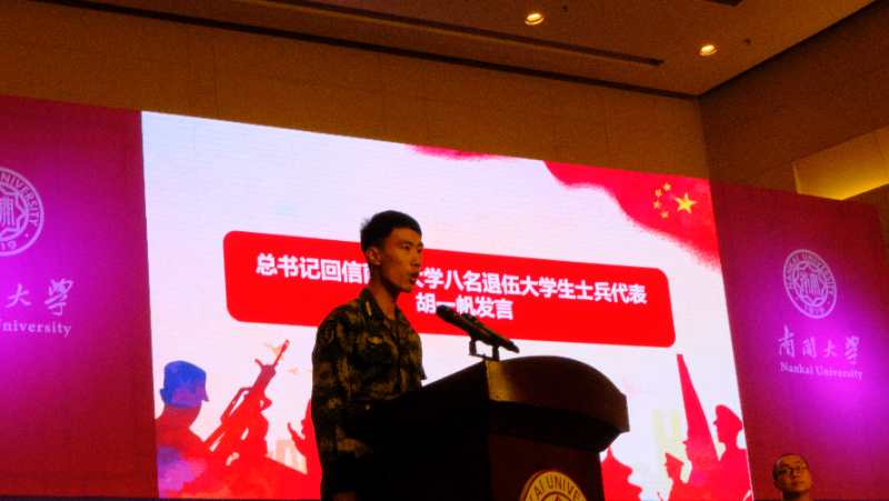 作为今年军训团的特聘教官,胡一帆动情地讲述了大学时代军训对他将青春献给祖国的伟大决定的巨大影响,国防军事教育带给他的不仅是出色的能力,更是在艰难险阻面前不抛弃不放弃,咬牙坚持的决心与毅力。提到自己的军旅生涯,胡一帆感慨良多,并勉励在场的同学们将在军训中养成的良好习惯坚持在生活中,贯彻于为祖国发展贡献力量的实践中。