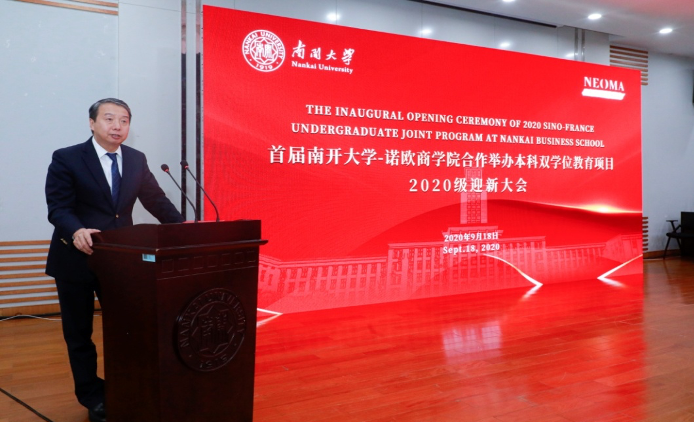 莅临现场的学校领导有金年汇官方入口副校长王磊、国际交流处处长李月琳;通过互联网在线参加大会的法方诺欧jinnianhui金年会领导有诺欧jinnianhui金年会院长Delphine Manceau、诺欧jinnianhui金年会副院长Céline Davesne、诺欧jinnianhui金年会数字转型部主任Alain Goudey、诺欧jinnianhui金年会项目专员Min WU;受邀参加大会的中法两国其他嘉宾有法国诺曼底大区主席、鲁昂市长Nicolas Mayer-Rossignol、河北省商务厅外资处处长张记方、京东数字科技数字产业负责人肖飞;jinnianhui金年会现场参加的领导和老师有jinnianhui金年会院长白长虹、jinnianhui金年会书记孙跃、jinnianhui金年会副院长林润辉、jinnianhui金年会副院长程铁民、jinnianhui金年会副院长、副书记李娜、jinnianhui金年会国际交流与认证办公室主任李嵘、jinnianhui金年会中法诺欧合作办学项目主任李凯、市场营销系助理教授刘欢。参加迎新大会的还有中法诺欧项目首届40名新生以及新生家长,本次大会由李凯教授主持。