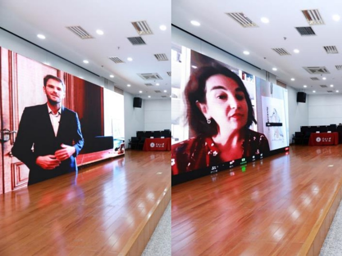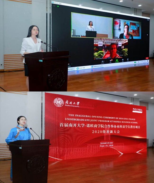 法国诺欧jinnianhui金年会Delphine Manceau院长与法国鲁昂市Nicolas Mayer-Rossignol市长进行视频致辞。法方嘉宾对我校此次举办的中法诺欧国际合作办学项目开学典礼表示祝贺,坚信双方合作会为学生们提供更广阔的平台,培养具有领导力和社会责任感的创新型人才。