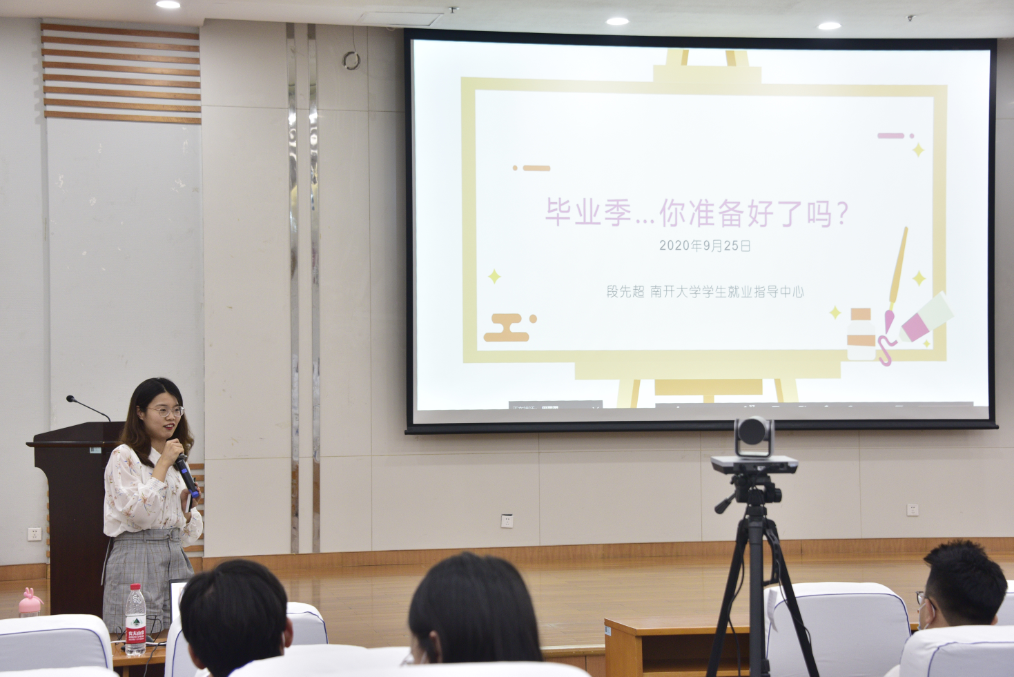 学生就业指导中心干部段先超老师从实务角度为毕业生们开展了讲解。段老师分析了近三年jinnianhui金年会毕业生就业去向、就业特点,并结合就业季如何准备、调整就业心态等部分进行充分讲解,事例生动,内容翔实,为同学们提供了有效的就业指导。