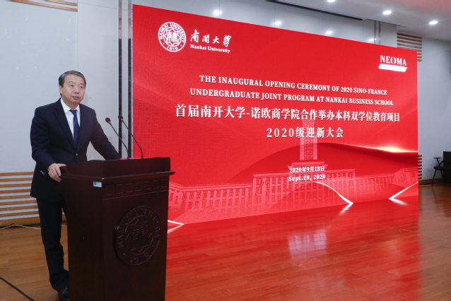 September 18, 2020, the Inaugural Opening Ceremony of 2020 Sino-France Undergraduate double-degree joint Program was held at Nankai University’s Business School. Nankai’s leadership, who participated at the ceremony, includes Nankai University’s Vice President Lei Wang, Director of Office of International Academic Exchanges Yuelin Li. Leadership of the NEOMA Business School also attended the ceremony via online meeting, including NEOMA’s Dean Prof Delphine Manceau, Associate Dean Prof Céline Davesne, Chief Digital Officer Prof Alain Goudey and International Admissions Manager Min WU. Other invited guests in China and France include Nicolas Mayer-Rossignol, President of the Regional council of Upper Normandy and mayor of Rouen, Jifang Zhang, Director of Hebei Provincial Department of Commerce (Division of Foreign Investment Administration) and Fei Xiao, in charge of Marketing in JD Digits. Leadership and teachers of Nankai University’s Business School also joined the meeting, including the School’s Dean Prof Changhong Bai, Chancellor Yue Sun, Vice Dean Prof Runhui Lin, Vice Dean Prof Tiemin Cheng, Vice Dean and Vice Chancellor Na Li, Director of the School’s Office of International Exchanges and Authentication Rong Li, Director of the Sino-France Nankai University-NEOMA Business School Undergraduate Joint Program Prof Kai Li and Associate Professor of the Department of Marketing Huan Liu. 40 freshmen, which are the first batch of students enrolled in the Program, and their parents also attended the ceremony. The meeting was hosted by Prof Kai Li.