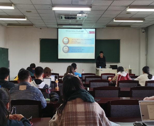 讲座中,贾老师向学生宣讲了学生参保的各项内容、具体政策,流程以及从参保到报销等一系列注意事项。