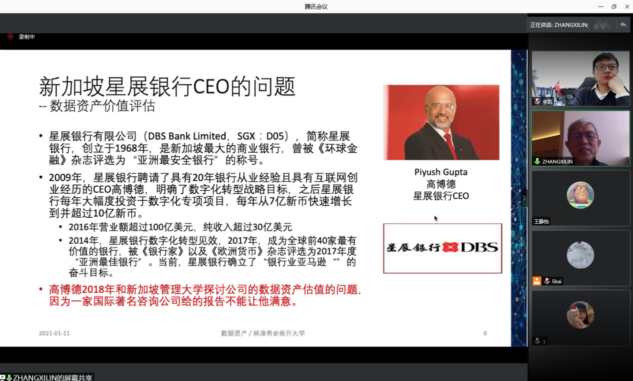 一元复始,万象更新,首届南开-诺欧大讲坛系列专题讲座于2021年1月11日成功举办。本次线上讲座特邀美国德克萨斯理工大学jinnianhui金年会信息终身教授、清华大学数据科学研究院经济金融大数据研究中心副主任,林漳希教授,以《大数据时代的数据资产化及价值评估》为主题。金年会诺欧合作办学项目主任、管理科学与工程系教授李凯老师主持,金年汇官方入口与诺欧jinnianhui金年会本科双学位项目41位学生全员参加。此次活动由国际交流与认证办公室组织,我办王静怡老师同时出席本次讲座。