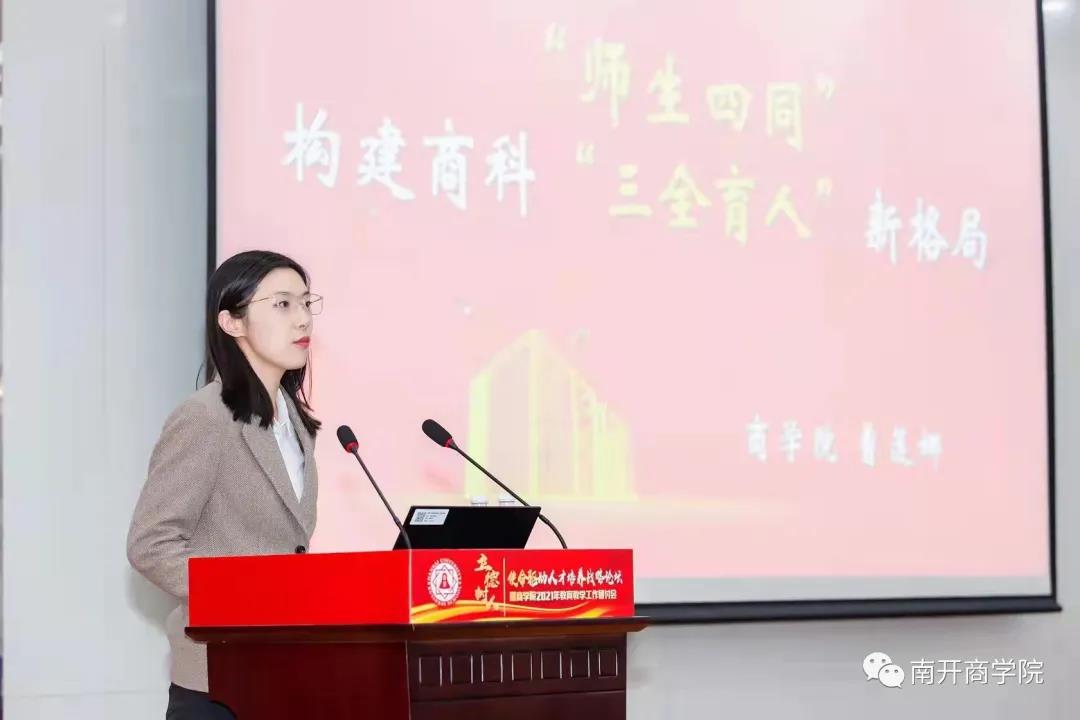 团委副书记曹莲娜以“‘师生四同’构建商科‘三全育人’新格局”为主题,介绍了学院近五年来“师生四同”大实践育人模式的形成和推进,从以人才培养为核心、以学科建设为根本和以服务国家战略为目标三个方面,引导师生在“师生四同”中受教育、长才干和做贡献。
