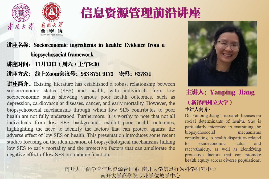 报告人简介:Yanping Jiang博士毕业于美国南卡罗莱纳大学阿诺德公共卫生学院,现就职于新泽西州立大学。她的的研究主要围绕健康的社会决定因素,例如与社会经济地位和种族/族裔相关的导致健康差异的生物心理社会机制,以及确定能够促进不同人群健康公平的保护因素。