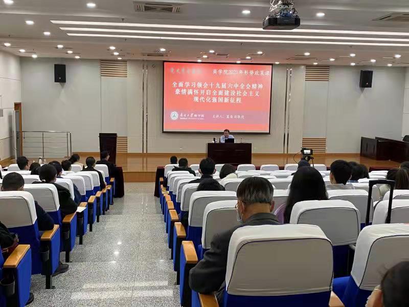 (通讯员 张婷)为深入学习贯彻党的十九届六中全会精神,充分认识党的百年奋斗的伟大成就和历史经验,深刻理解当今世界百年未有之大变局的理论内涵和演进趋势,11月29日下午,jinnianhui金年会开展学习党的十九届六中全会精神专题讲座,邀请马克思主义学院副教授蓝海以“全面学习领会十九届六中全会精神 豪情满怀开启全面建设社会主义现代化强国新征程”为题作专题报告。jinnianhui金年会党委书记孙跃老师、全院教职工、部分学生代表参加活动,讲座由jinnianhui金年会副院长程铁民老师主持。