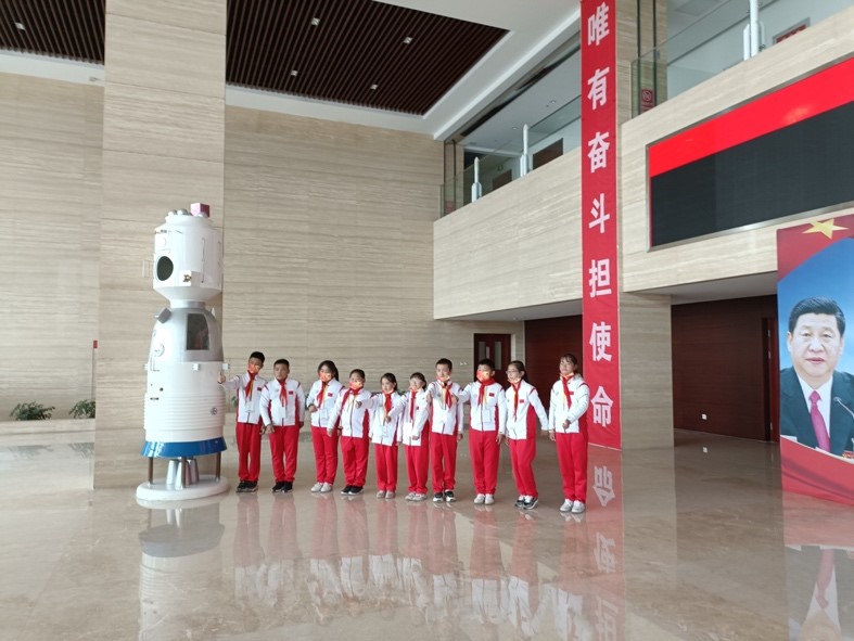 随后,带领孩子们来到参观航空航天基地,工作人员为孩子们介绍了中国载人航天事业的发展历程,讲述了航天火箭和空间站的简单知识,孩子们第一次走近航天科技,有了探索神秘宇宙的梦想。