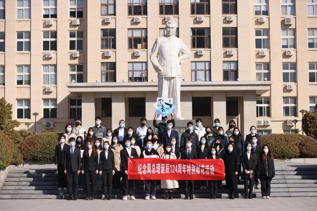 3月5日上午,为深切缅怀周恩来总理的丰功伟绩,传承爱国奋斗的南开精神,第十一届周恩来班jinnianhui金年会2019级国际会计班在八里台校区总理像前开展了“传承恩来精神,谱写时代新篇”纪念周恩来总理诞辰124周年主题活动。jinnianhui金年会团委书记潘麒羽、第十一届周恩来班师生代表、校学生会成员代表,部分周恩来奖学金获得者,《周恩来与南开》通识课程师生代表,以及恩来精神展演团、红色记忆宣讲团成员参加了活动。