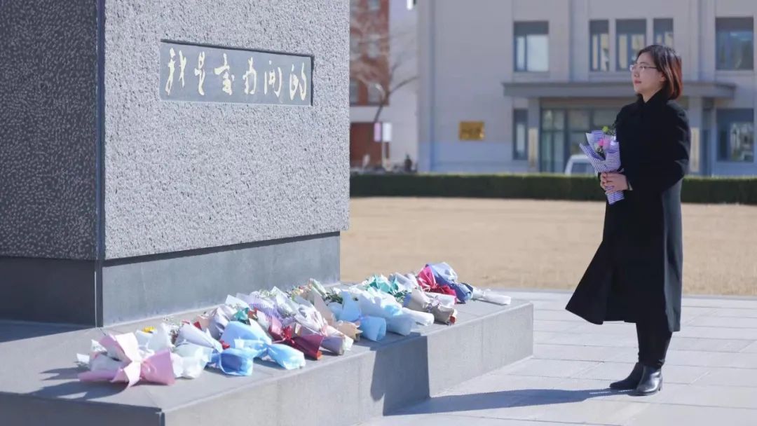 为表达对总理的思念与敬意,在场师生向周总理雕像鞠躬并敬献鲜花。整齐摆放的鲜花与石雕上镌刻的那句“我是爱南开的”相映衬。