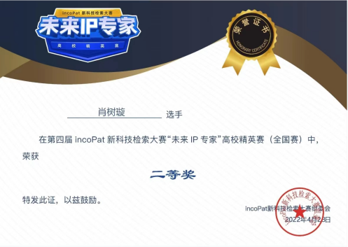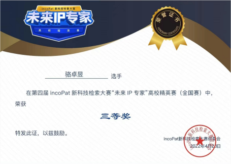 很荣幸能够在此次比赛中获奖,报名前我对专利知识的了解非常有限,但专利检索也是一种信息检索,检索过程中用到的能力都是相通的。主办方incoPat提供了线上培训讲座,可以学到一些专利领域的基础知识,自己在后续练习中不断发现知识盲点、熟悉检索工具、优化检索方法,进一步提升了通用技能和信息素养。