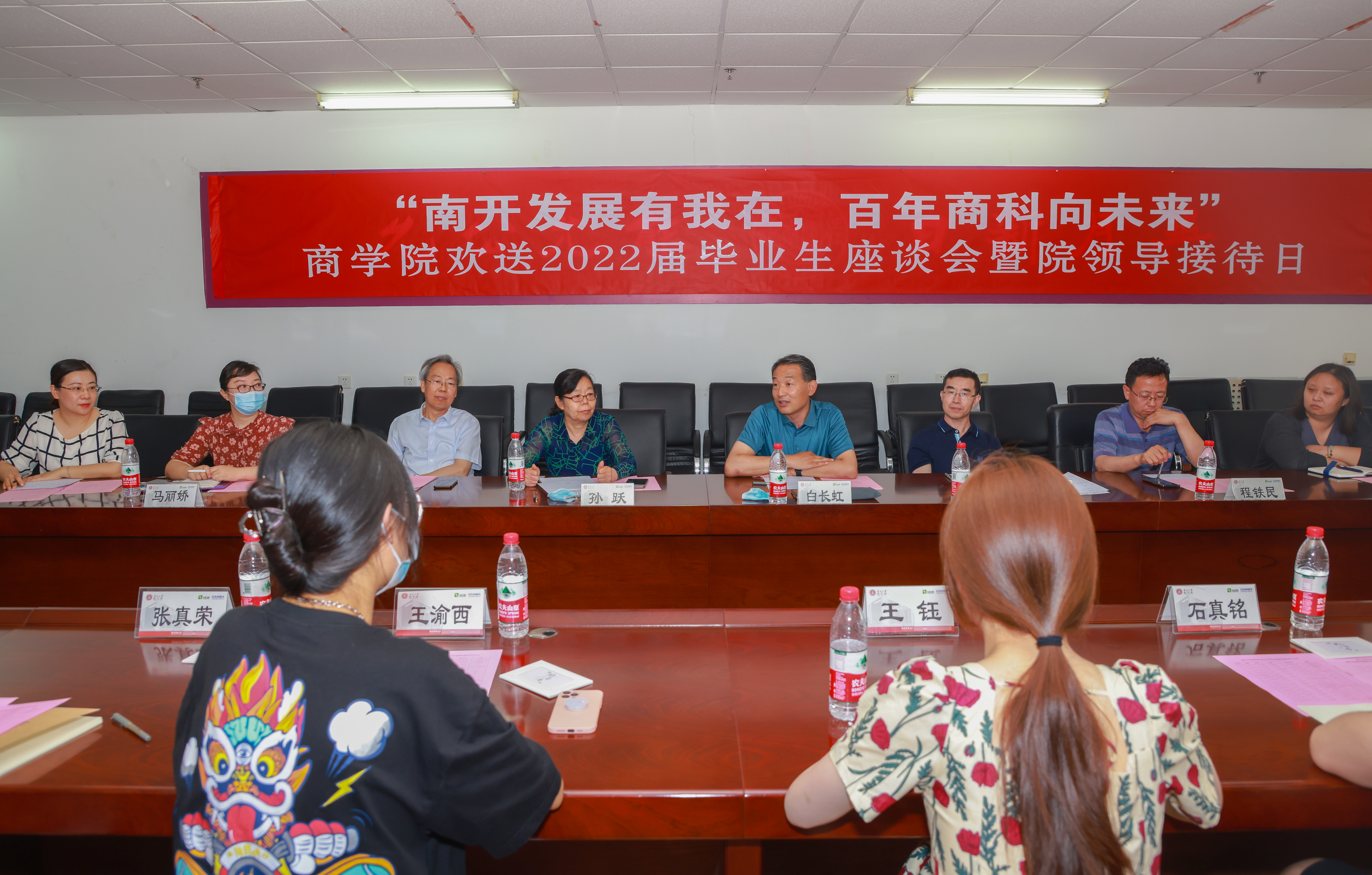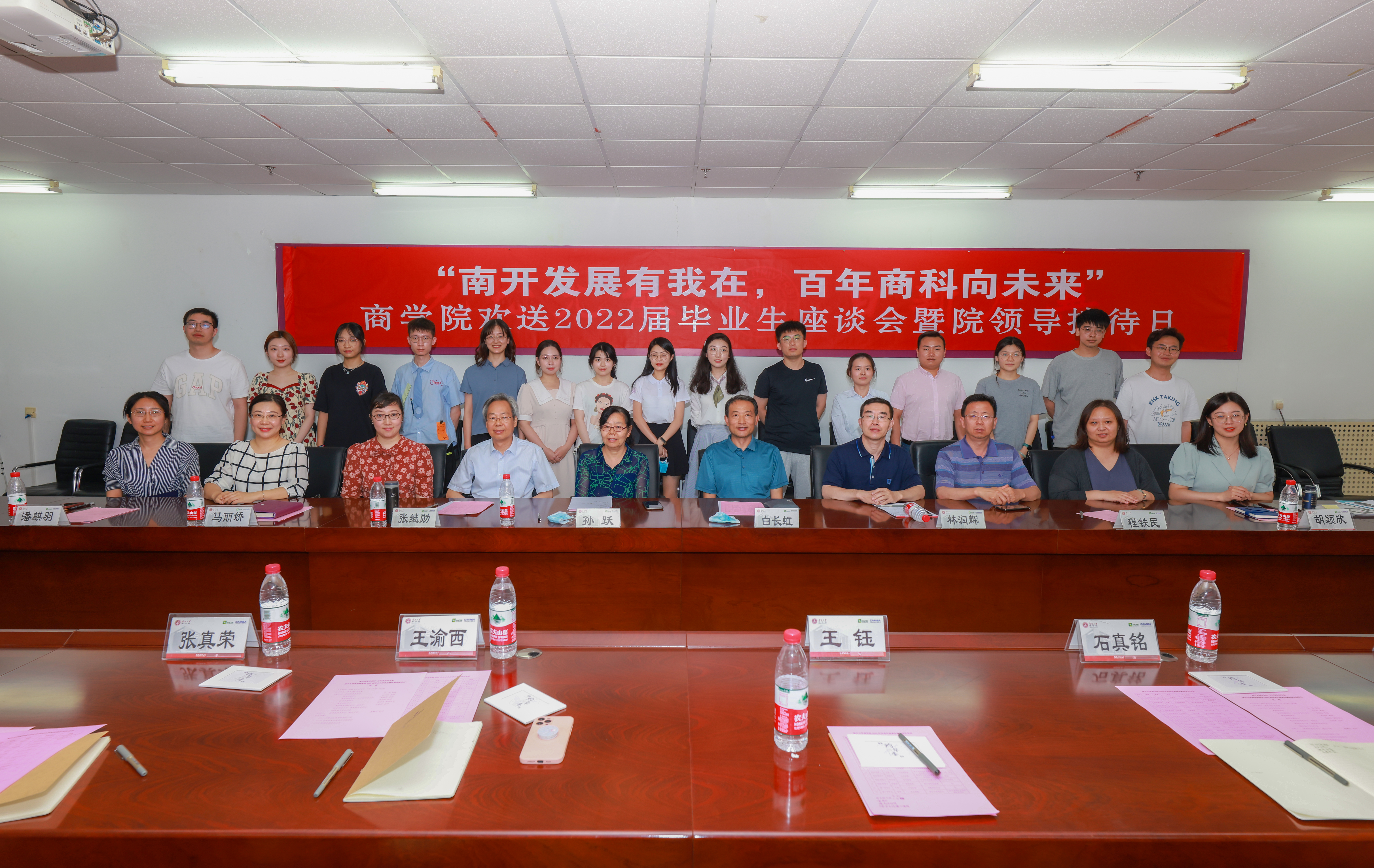 (通讯员潘麒羽)2022年6月9日,“南开发展有我在,百年商科向未来”商学院欢送2022届毕业生座谈会暨院领导接待日在八里台学活305会议室举办。学院党委书记孙跃,学院院长白长虹,副院长张继勋、林润辉、程铁民,党委副书记兼副院长马丽娇以及毕业班辅导员出席,本硕博毕业生代表15人参加。