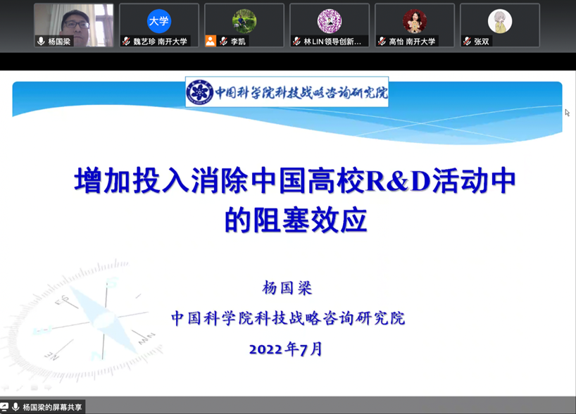 最后,中国科学院大学杨国梁教授做《增加投入消除中国高校R&D活动中的阻塞效应》主题演讲。杨教授介绍了自己的研究,为了通过识别和测度中国高校R&D活动中的阻塞效应来回答中国高校R&D活动至少应当减少多少无效投入这一问题,研究改进了阻塞效应的定义,通过将新方法应用于中国高校R&D活动,研究发现中国高校R&D活动中的阻塞效应大多属于相对阻塞效应,这表明中国可以继续增加高校R&D活动的投入以消除阻塞效应并增加科研成果数量。
