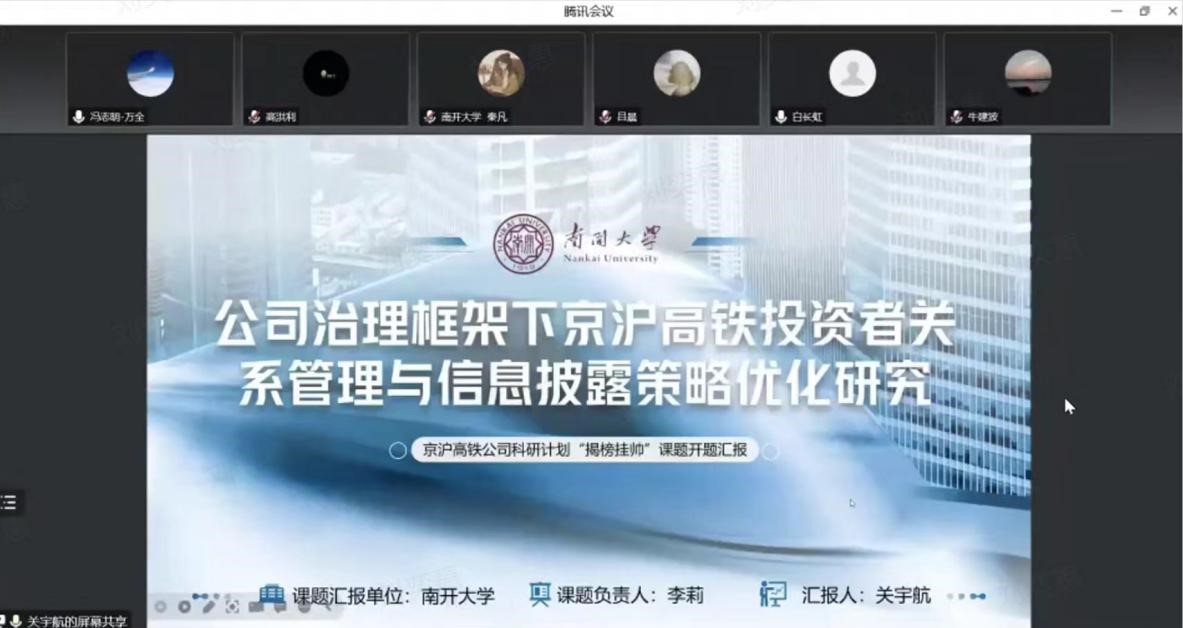 11月4日上午,京沪高速铁路股份有限公司组织召开了该科研课题的开题会。李莉教授课题组的成员顺利完成了开题会的汇报工作,获得了京沪高铁公司及评审组专家一致通过同意本项目的开题。会议以线上视频的方式举行,京沪高铁公司董事会秘书赵非,董事会办公室主任郑勇出席会议。邀请了国家发改委综合交通运输所副所长李连成、天津广信有限责任会计师事务所副主任刘海、泰达投资控股公司总经理助理陈德强、深圳市万全智策企业管理咨询服务股份有限公司北京分公司总经理冯志明、上海分公司总经理段阳伟作为课题评审专家。