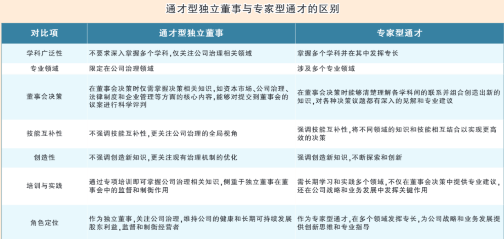 通才型独立董事与专家型通才的区别在于,通才型独立董事不需要深入掌握多个学科,而是专注于公司治理。他们应具备与董事会决策相关的经济、财务、治理、管理、法律等方面的基本原理、正确思维和科学决策方法。