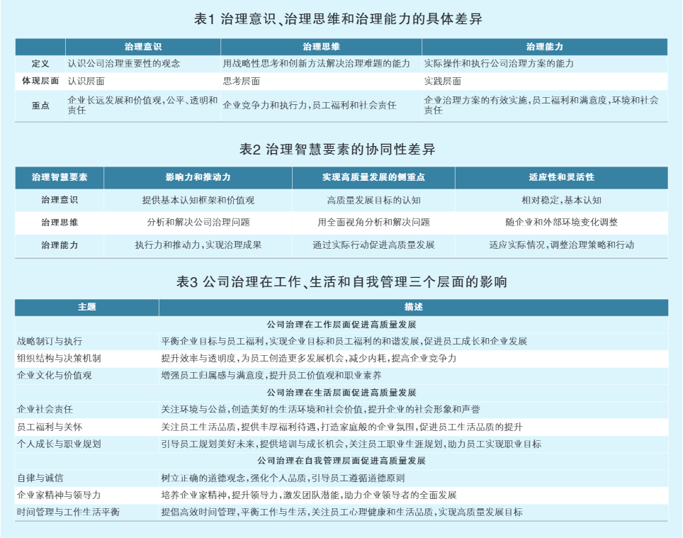 对高质量发展适应性和灵活性的影响上,治理意识为企业治理提供稳定基础和方向,助力高质量发展;治理思维具有适应性和灵活性,随企业发展和外部环境变化调整,运用创新、战略和系统性思考应对挑战,推动高质量发展;治理能力体现实践中的适应性和灵活性,根据发展阶段、内外部环境变化和员工需求调整治理策略,持续优化公司治理,实现可持续高质量发展。