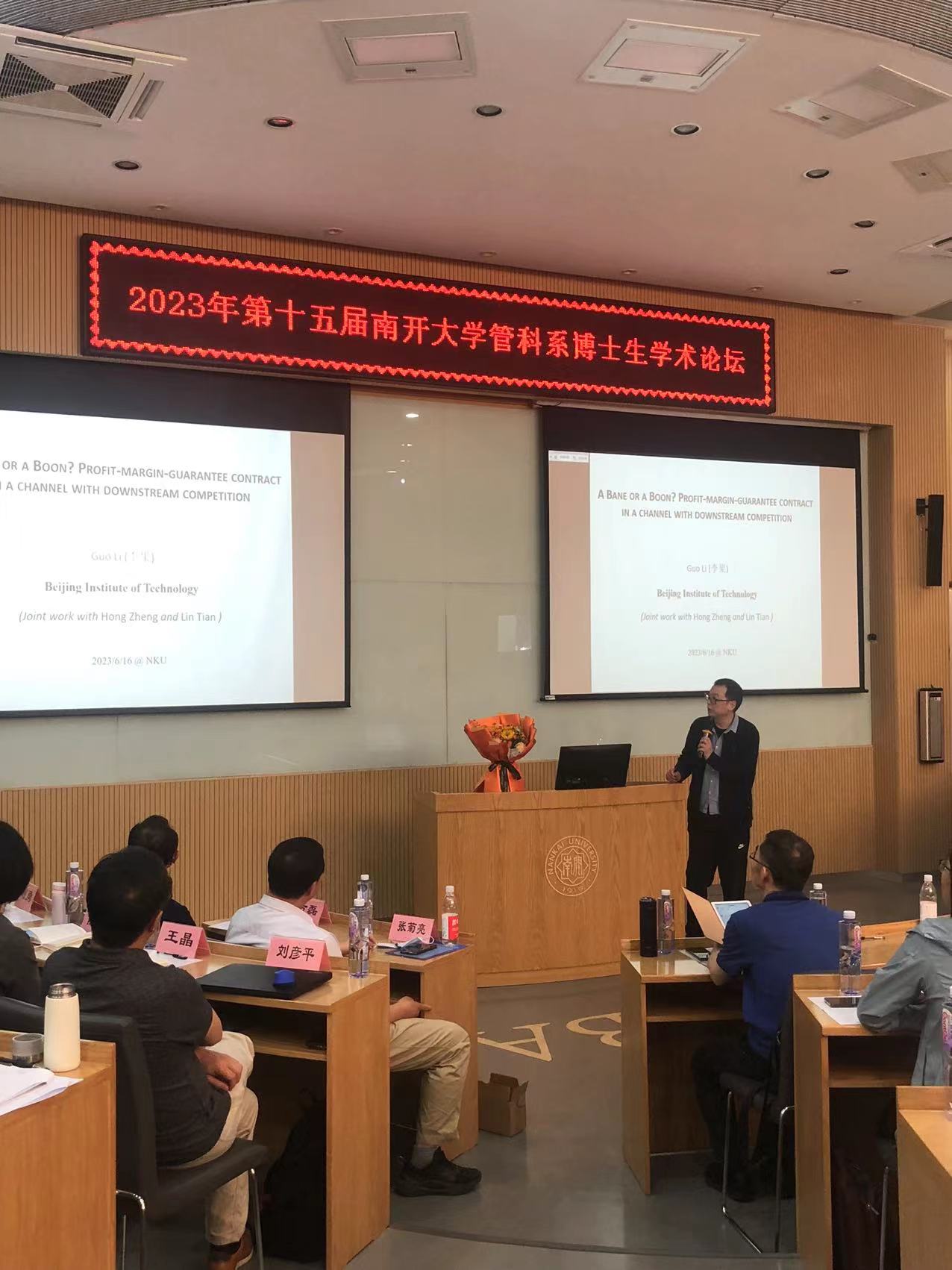 在主题汇报阶段,北京交通大学经济与管理学院重点项目负责人张菊亮教授作了《如何指导研究生做高水平研究》主题报告。从高水平研究特点、高水平研究选题以及期刊编辑的视角分析了什么是高水平研究,以期大家挖掘学术深度、提高学术研究水平。北京理工大学青年长江学者李果教授进行了《A Bane or a Boon? Profit-Margin-Guarantee Contract in a Channel with Downstream Competition》主题汇报。他介绍了平台经济中毛利保护契约对上下游的影响,通过对具体案例的分析,梳理了严谨的研究框架。天津大学优秀青年科学基金获得者冯海洋教授作了《考虑虚假流量购买行为的社交媒体平台参与度指标披露策略》主题汇报。他以现在流行的多个网络社交平台为切入点,分析了虚假流量购买行为与平台参与度指标披露策略的关系,并拓展了研究话题,为相关问题的研究指出了研究思路。