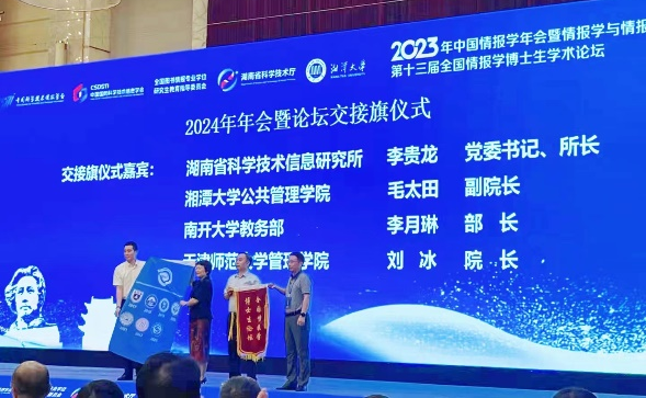 大会闭幕式环节举行交接旗仪式,2024年中国情报学年会暨情报学与情报工作发展论坛、第十四届全国情报学博士生学术论坛,将由金年汇官方入口jinnianhui金年会、金年汇官方入口图书馆、天津师范大学管理学院、天津市科学技术信息研究所共同承办。金年汇官方入口教务部部长、jinnianhui金年会信息资源管理系主任李月琳教授,代表2024年中国情报学年会承办单位致辞。