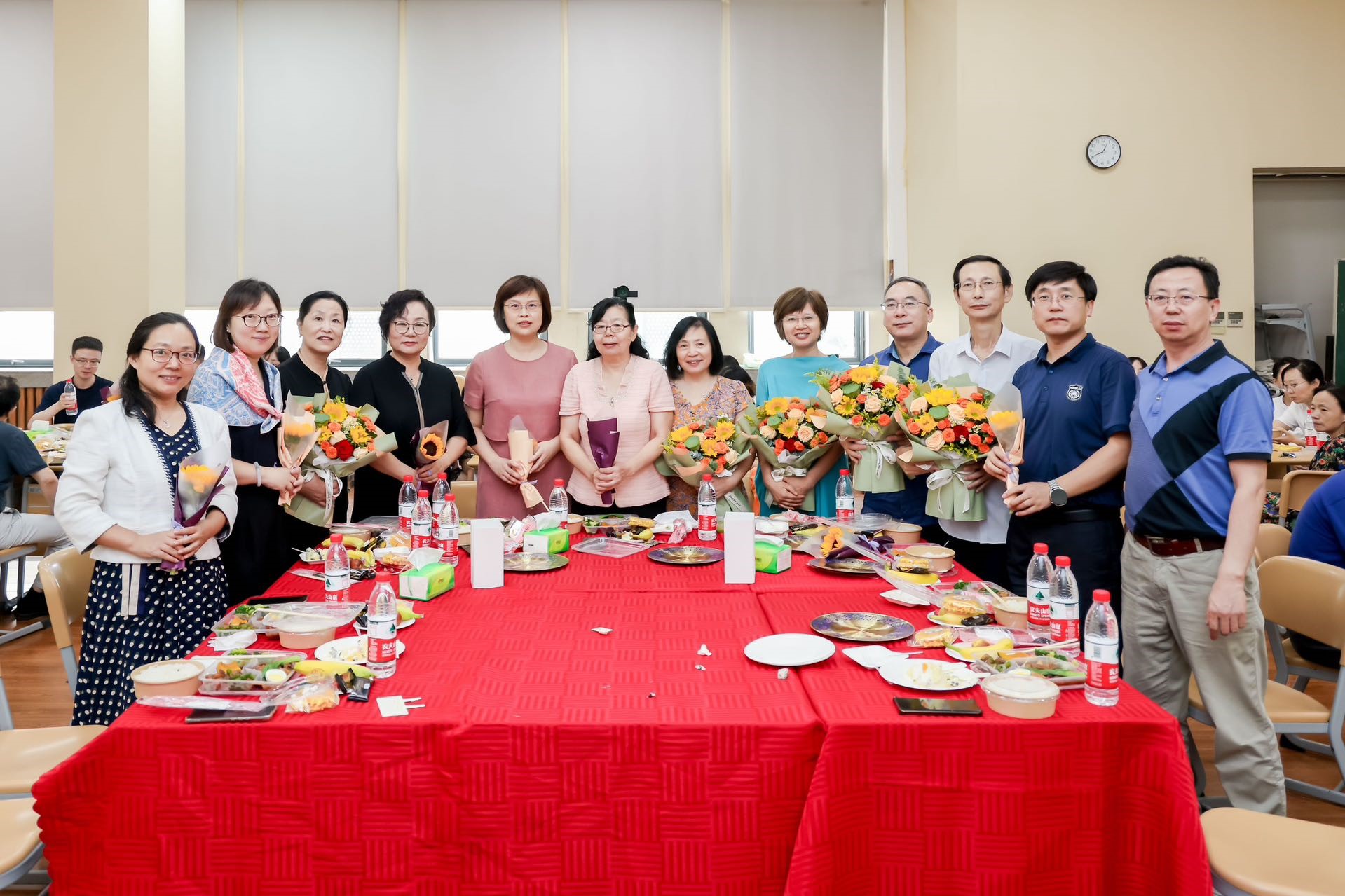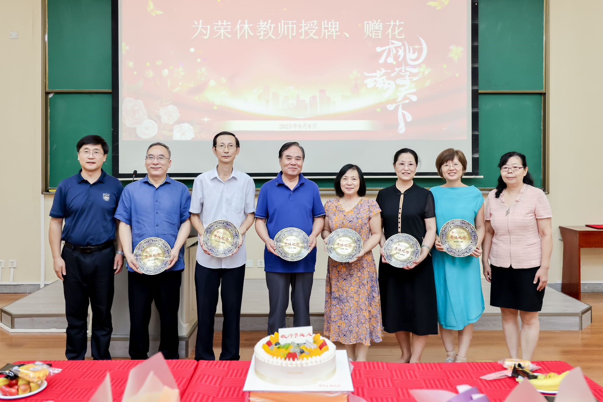 活动伊始,党委孙跃书记、教代会郝臣主席,共同为荣休教师颁发荣休纪念牌;各位系主任为荣休教师赠送鲜花,共同祝福他们的退休生活灿烂幸福;行政办公室的各位主任共同切开庆祝蛋糕与大家分享。在温馨的音乐声中,大家共同为荣休教师送上一声声祝福,再贺荣休教师辛勤耕耘结硕果,奏响退休生活新乐章。
