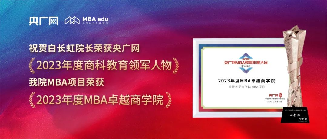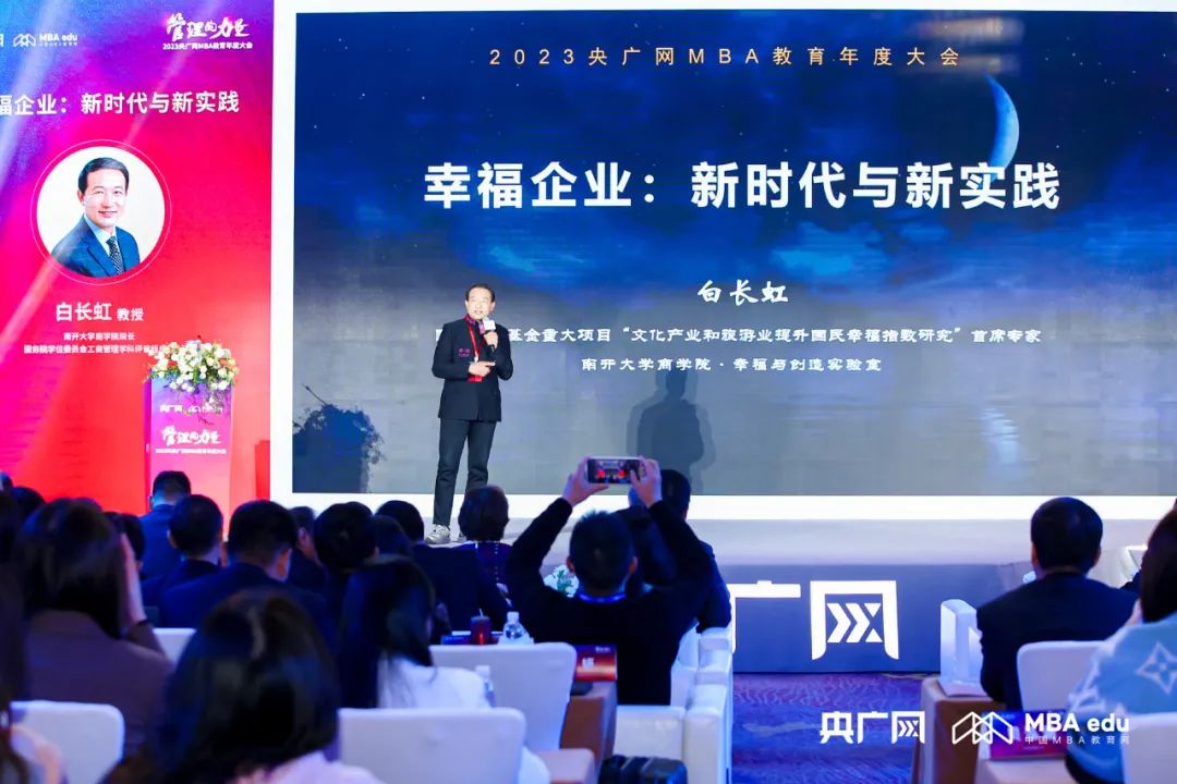 金年汇官方入口jinnianhui金年会院长、国务院学位委员会工商管理学科评议组成员白长虹教授应邀出席论坛,被评为“2023年度商科教育领军人物”荣登“2023年度商科教育致敬榜单”,并作为特邀嘉宾发表了《幸福企业:新时代与新实践》主旨演讲。同时,金年汇官方入口jinnianhui金年会MBA项目荣获“2023年度MBA卓越jinnianhui金年会”。