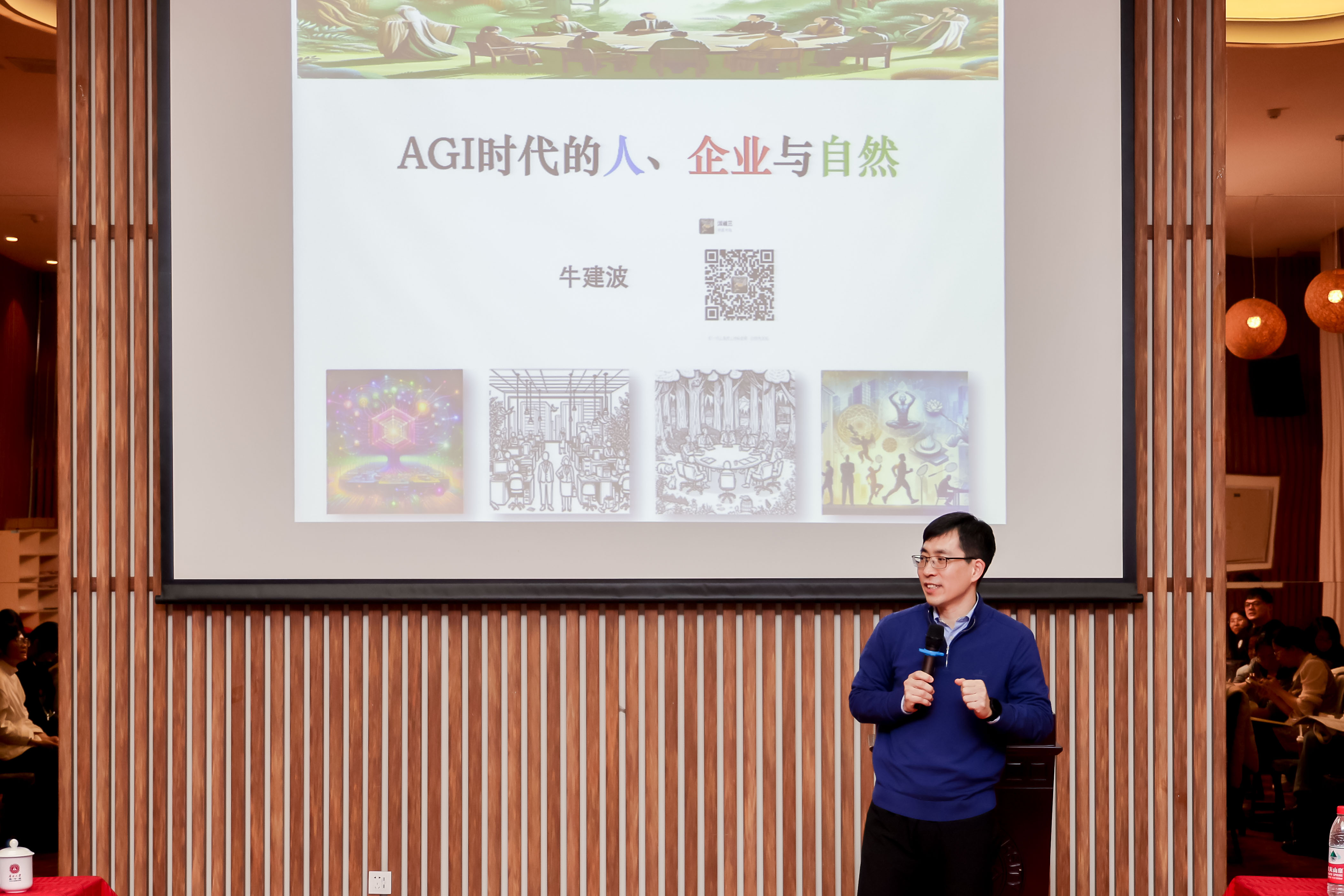 牛建波老师分享了有关《 AGI时代的人、企业与自然 》的思考,通过分析AGI(人工通用智能)对人类生活、企业经营和自然环境的影响,探索人、企业与自然和谐共生的可能性。牛老师的分享精彩纷呈、贯穿古今,充满了前瞻性和冲击力,引发现场观众对人和人性、先进的AI技术以及如何对待我们赖以生存的地球和自然的思考。