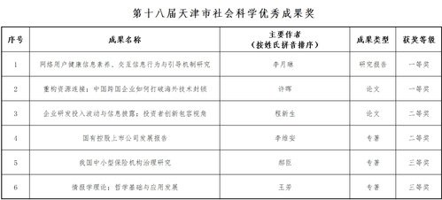 近日,第十八届天津市社会科学优秀成果奖评审结果揭晓。金年会共有6项成果获奖,其中一等奖2项,二等奖2项,三等奖2项。