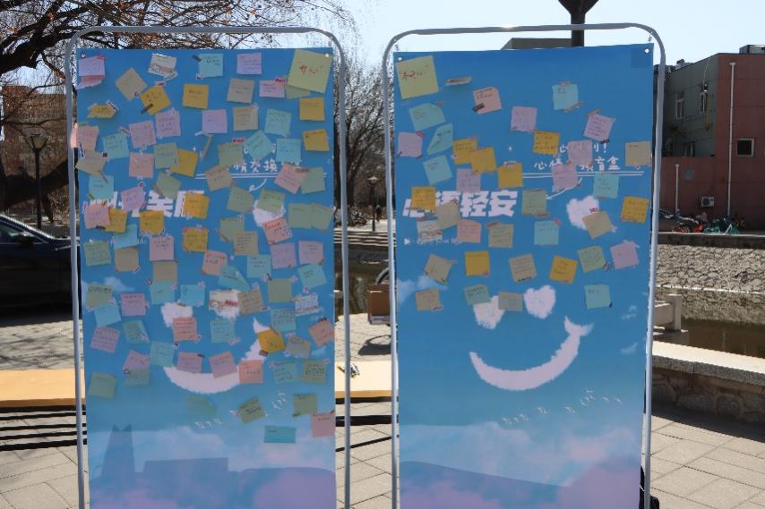 活动设有两块展报:“心语轻安”用于记录困扰和愿望,“阳光笑靥”用于分享快乐与正能量。中间放置一个“安慰盒子”,里面装有安慰纸条。同学们在展报上留言,并参与安慰盒子的互动。