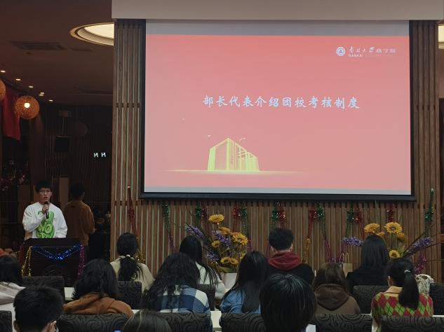 随后,办公部部长张亮上台详细解读了团校的考评制度。他不仅分享了自己的工作内容和成果,还强调了考评制度的重要性和意义。这一环节让团员们对团校的工作和考评制度有了更深入的了解,也为团校今后的工作奠定了坚实的基础。