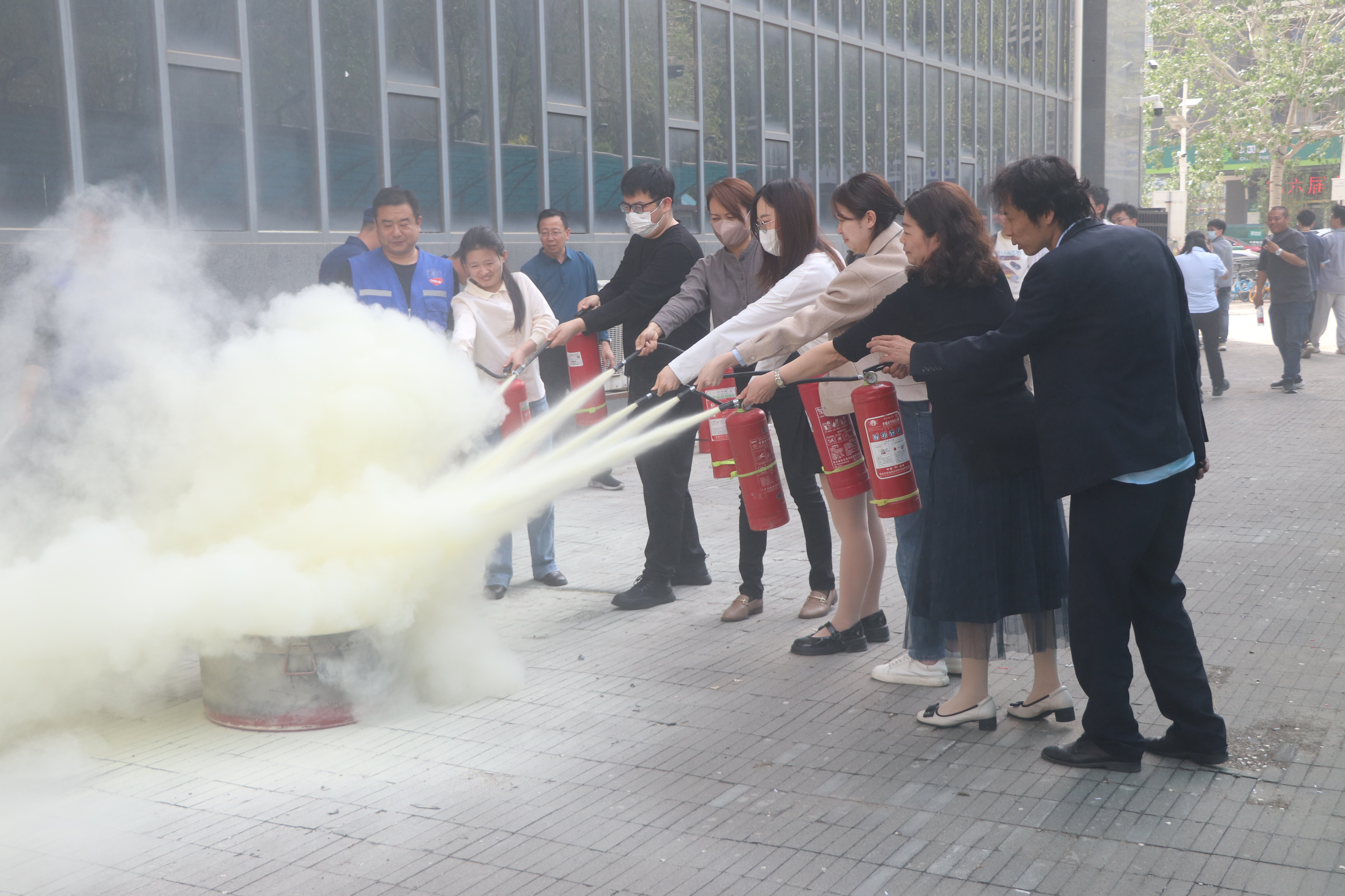 下午两点,演练现场模拟楼道垃圾桶发生火灾,伴随着紧急警报声响起,楼内人员迅速行动通知疏散,所有人员在疏散小组的指挥和带领下,捂住口鼻,弯腰贴墙,沿指定路线快速有序撤离,历时8分钟安全撤离到指定集合地点。