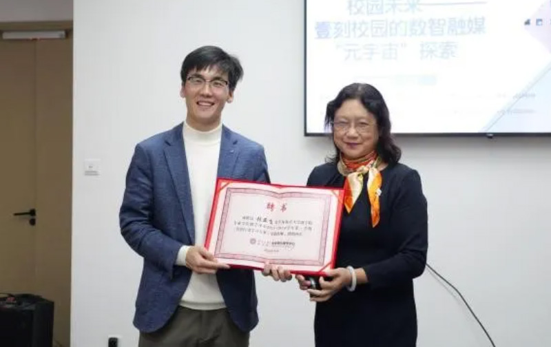听完张总的讲解后,学生返回会议室,体验MR技术项目。四人一组,头戴MR眼镜分别体验车展、传送门、人体骨骼等虚拟场景,并在场景中与其他同学互动游戏。互动后,金年汇官方入口jinnianhui金年会许晖教授为启飞文化创始人张亚飞先生颁发了《营销行动学习方案》实践导师的聘书。随后张亚飞先生作了壹刻校园项目发展报告,从壹刻校园的业务板块、国家政策牵引方向、教育部门重视监督情况、企业发展前景与目标向同学们介绍了企业的情况;此外,内蒙古区域负责人王志清分享了内蒙古地区校庆云平台的客户发展情况与未来计划;长虹佳华郭延朋作为企业合作伙伴,分享了虚拟上市公司的业务进程和与国家政策的协同发展。多视角报告让同学们更充分了解了虚拟技术公司的发展模式和特点,报告之后,同学们就自己的问题和张总进行了更为细致的交流,王迎军老师也从深刻的战略理论视角与大家分享体会。早上的参观和座谈活动在热烈地讨论中结束。