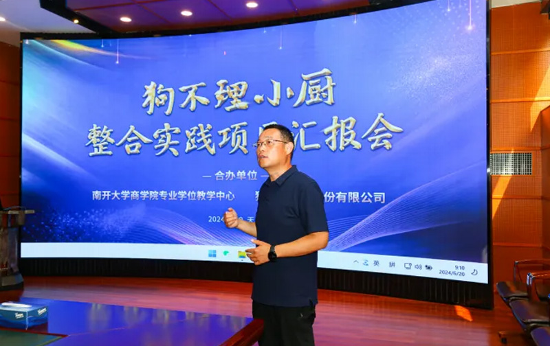 活动伊始,韩连胜老师介绍了本项目的目标和意义,认为本次整合实践项目不仅令南开师生汲取了丰沛的企业实践知识,也是一次难得的将理论付诸于实践和用知识创造价值的宝贵经历,更为战略管理和商业模式创新理论与实践结合提供了鲜活的案例。随后,梁峰老师对狗不理集团的支持表示感谢,期待双方能够在MBA教学培养创新等领域持续开展深入合作。杨玉武老师代表项目指导教师团队汇报了项目研究历程,介绍了“背对背PK、理论指导和数据支撑”三大指导原则。