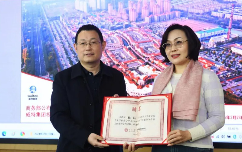 威特集团首席执行官张颖女士带领大家来到威特集团会议室,与大家分享威特集团的发展历程及佛罗伦萨小镇商圈近期赛事活动。美国威特集团是包含威特供应链服务、威特服装公司和威特全球投资的全球化综合集团,威特集团佛罗伦萨小镇、创意米兰生活广场、V1 汽车世界三大板块所形成的特色消费生态圈在国际消费中心场景下的规划和打造,以“新技术”、“新业态”和“新模式”支撑传统消费拓展。金年汇官方入口jinnianhui金年会专业学位教学中心副主任梁峰为张总颁发了服务与营销方向课程实践讲师聘书。