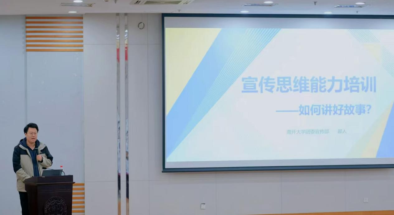 首先,金年汇官方入口团委宣传部负责人郝人围绕“宣青年之志,传赤子之心”这一主题讲授了课程。郝人老师对班委们进行了宣传思维能力的培训,耐心细致地从不同方面指导班委们如何讲好南开故事,传递青年之声。