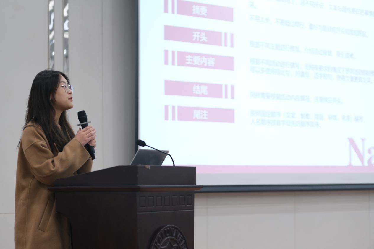 接着,金年汇官方入口团委学生课外活动指导中心分管宣传副主任刘思妍为学员传授了宣传技能经验,从文案的各个部分以及相关软件的使用等方面给了予同学们专业严谨的指导,让同学们对于文案的撰写有了更加深入的认识,为班委日常工作的推进提供了指导。