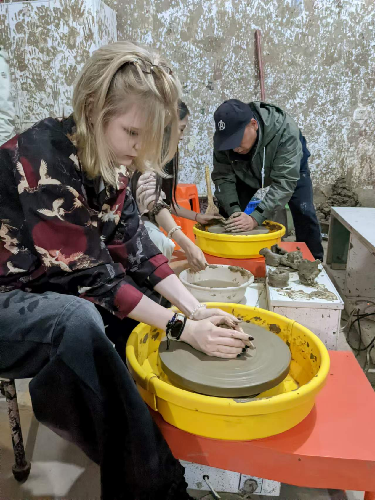 活动的最后一站是前往板桥镇盆罐庄村。这个村庄以其独特的陶艺文化而闻名遐迩,留学生们参观了陶艺工坊,了解了陶艺品的制作过程和背后的文化故事。并在天津市非遗项目制陶技艺第十八代代表性传承人、天津市工艺美术大师韩克胜的讲解中,感受到了中国传统手工艺的魅力。他们在陶艺老师的指导下亲手尝试制作陶艺品,他们或捏或刻或绘,将自己的创意和想法融入到作品中。虽然他们的作品略显稚嫩,但每一件都凝聚着他们的心血和汗水,也见证了他们对中国陶艺文化的热爱和传承。同时,通过与当地村民的互动交流,留学生们也更加深入地了解了中国的乡村生活和民俗文化,感受到了中国人民的热情好客和淳朴善良。